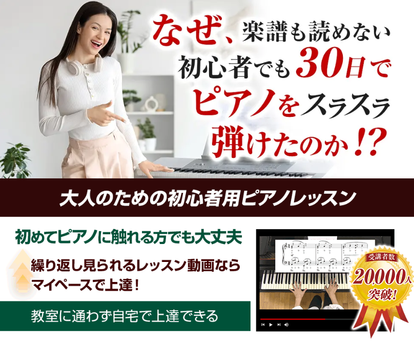 2万人以上が実践し、「行列のできるピアノ教室」として話題の海野真理先生が、全くの初心者のために開発した画期的なピアノ講座なら、あなたの夢を叶えられます。